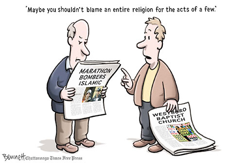 I don’t know if the two who perpetrated the Boston bombing labeled themselves as Muslim but a true practitioner of any religion would never commit such an act of violence. It goes against the golden rule which is one of the main teachings in almost every religion. Christianity: Do onto others as you would have them do to you. Judaism: What is hateful to you, do not do to your neighbor. Islam: Not one of you truly believes until you wish for others what you wish for yourself. Hinduism: This is the sum of duty: do not do to others what would cause pain if done to you. Taoism: Regard your neighbor’s gain as your own gain, and your neighbor’s loss as your own loss. Regardless of how you word it, it’s the same message in every religion and a true believer and practitioner should would never brake this golden rule. My point is that extremist are not truly religious people, at least not to me.