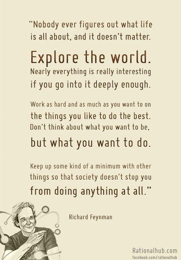 “Nunca nadie resuelve de que se trata la vida, y no importa. Explora el mundo. Casi todo es realmente interesante si te interesas profundamente. Trabaja lo duro que quieras y cuando quieras en las cosas que mas te gustan. No pienses en quien quieres ser, piensa que es lo que quieres hacer. Mantén algún tipo de mínimo con otras cosas para que la sociedad no te pare de hacer nada en absoluto.”