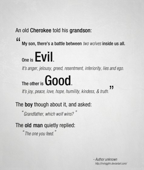 Un viejo indio Cherokee le dijo a su ñieto: “mi hijo, hay una batalla entre dos lobos dentro de cada uno de nosotros. Uno es el mal. Es enojo, envidia, codicia, resentimiento, inferioridad, mentiras y el ego. El otro es el bien. Es alegria, paz, amor, esperanza, humildad, gentileza y verdad.”
